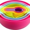 סט 8 חלקים של קערות, מסננת וכוסות מדידה עשוי פלסטיק בצבעים שונים.